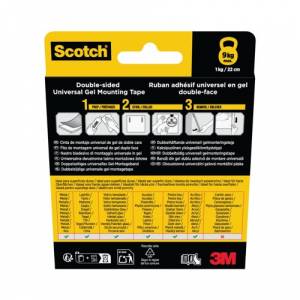 - Scotch Universal Gel Tape is a clear, double-sided mounting tape. The ideal solution for mounting on a variety of hard surfaces, securely holding up to 9 kg. The gel tape is suitable for light and heavy mounting applications and is water resistant offering a strong bond even in wet or humid conditions. Measuring 30mm x 3m, this gel tape is clear and removable when no longer required.
