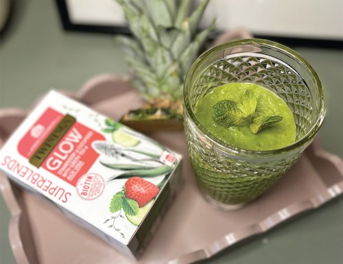 - Delicious herbal infusion with green tea, aloe vera and added Biotin. The Superblends Glow has a sweet strawberry and fresh cucumber flavouring for a refreshing drink at any time of the day. To be enjoyed as part of a balanced diet and healthy lifestyle, these tea bags are supplied in a box of 20 envelopes.