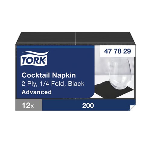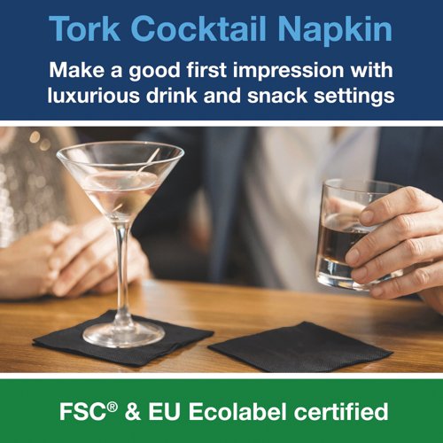 - Tork Cocktail Napkins are ideal for bars and cafes when serving snacks and drinks, adding a vibrant touch to the table. Featuring environmentally friendly certification, they are ideal for restaurants with a focus on sustainability. Supplied in Tork easy handling packaging, of which is made from at least 30 percent recycled plastic, this pack contains 200 black napkins.