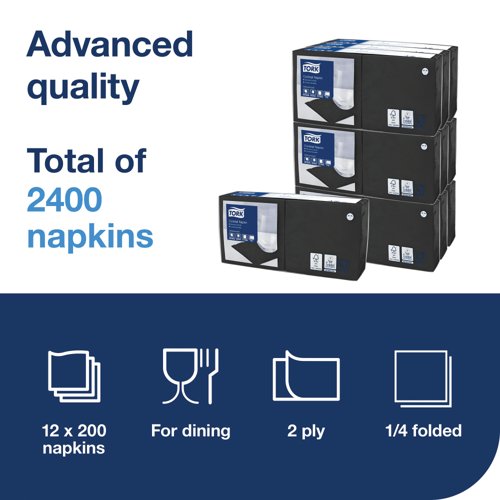 Tork Cocktail Napkins are ideal for bars and cafes when serving snacks and drinks, adding a vibrant touch to the table. Featuring environmentally friendly certification, they are ideal for restaurants with a focus on sustainability. Supplied in Tork easy handling packaging, of which is made from at least 30 percent recycled plastic, this pack contains 200 black napkins.