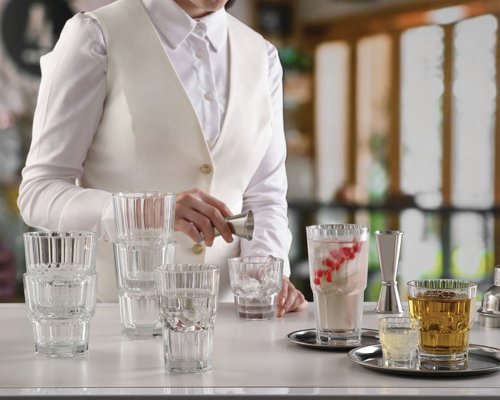 - Discover our fully toughened glass range, a remarkable fusion of rugged aesthetics and practicality. This collection seamlessly marries the rugged charm of its design with the durability of toughened glass, all while offering the convenience of stackability. It's a timeless addition that promises to become a classic choice for any venue. With a versatile selection of 7 essential pieces, this range opens up endless possibilities for enhancing your dining experience.