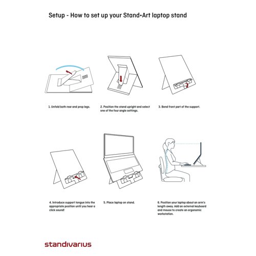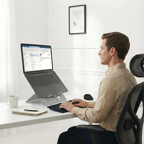 - Ergonomic laptop stand for business comfort and pain-free work. Developed to fit the majority of the laptops available on the market. The height adjustable design allows the standard to raise the laptop to a comfortable working position. A versatile ergonomic accessory designed to comply with UK and European health and safety regulations. Created with the user in mind: instant setup and pack away, lightweight and thin for true mobility, easily adjustable screen elevation and inclination. Refined design, minimalist but very sturdy, guaranteed against malfunction for life.