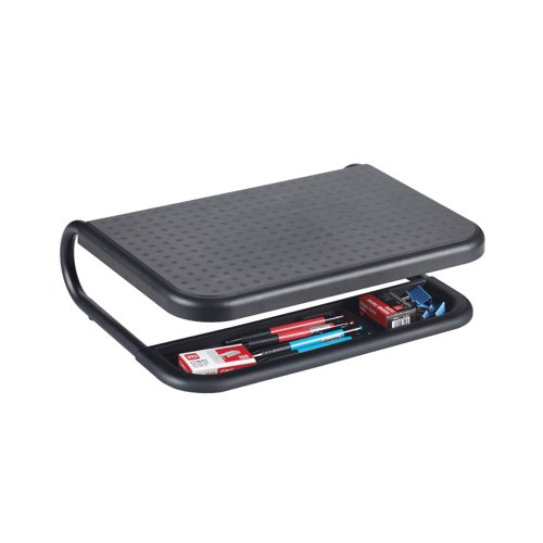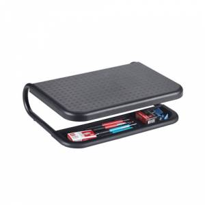 - Monitor stand with non-skid padded platform. It has a large storage area underneath with a cable manager at the back. Ergonomic and comfortable, elevate your screens to a more comfortable viewing height, reducing neck strain and relieving stress from prolonged work or gaming sessions. The monitor stand riser has a universal size design that is compatible with printers, computers, telephones and laptops. It also features a ventilated design to prevent overheating. The non-slip rubber pads provide stability during use.