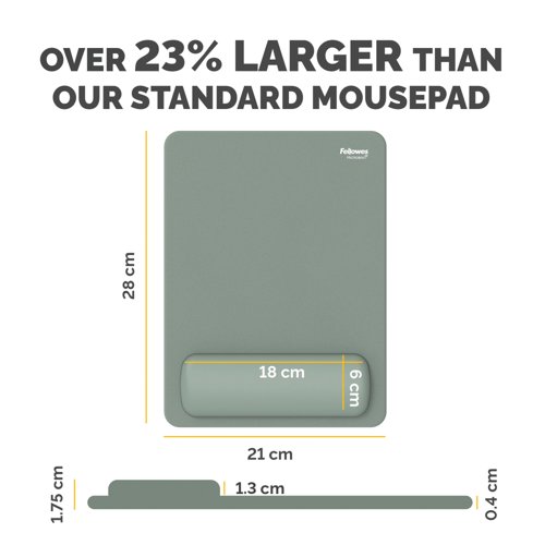 - Designed to encourage greater movement and reduce strain, the Breyta XL Mouse Pad Wrist Rest is 23% larger than the standard version-helping to minimise small, repetitive motions that can lead to wrist discomfort. It offers consistent support and exceptional comfort, with a soft-touch surface and anti-dust coating for a smooth, premium mousing experience. Built-in Microban protection works continuously to help prevent the growth of bacteria, keeping your workspace cleaner throughout the day. Optimised for both optical and laser mice, the pad enhances tracking performance while protecting your desktop. Made from 74% post-consumer recycled materials and fully recyclable through the Fellowes takeback scheme, it's an ergonomic upgrade for any desk.