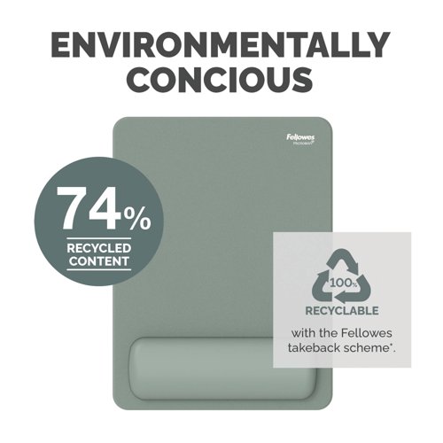 | MADE FROM 74% RECYCLED CONTENT - This Fellowes mouse mat is made from 74% post-consumer recycled content and is also 100% recyclable with Fellowes takeback scheme* |