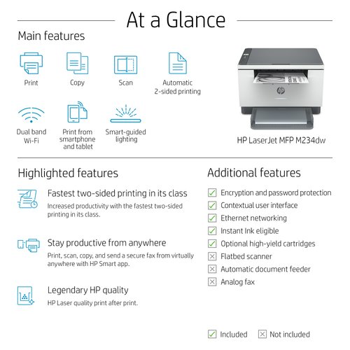 A high-productivity MFP with the fastest two-sided printing in its class and the time-saving HP Smart app. Count on peace of mind from more reliable connections, and a worry-free experience with simplified setup. This printer is intended to work only with cartridges that have a new or reused HP chip, and it uses dynamic security measures to block cartridges using a non-HP chip. Periodic firmware updates will maintain the effectiveness of these measures and block cartridges that previously worked. A reused HP chip enables the use of reused, remanufactured, and refilled cartridges.