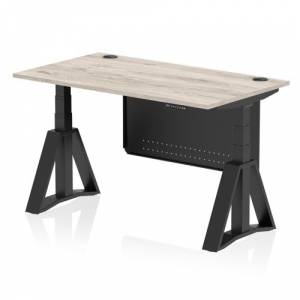 Air Modesty 1400 x 800mm Height Adjustable Office Desk Grey Oak Top Cable Ports Black Leg With Black Steel Modesty Panel with Piste Foot