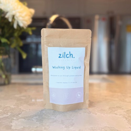 - The Zilch Washing Up Liquid easily cuts through grease and grime, leaving dishes sparkling clean. Its gentle yet effective formula is kind to hands but tough on grease. With a fresh, clean fragrance, it rinses away without residue. Supplied in a pack of 10, each pre-measured dose will fill 1 Litre bottles (sold separately).