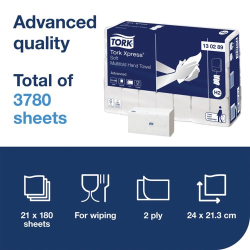 - Provide a quality hand drying experience for your guests with these soft Tork Xpress Multifold Hand Towels Advanced. Gentle on the hands with a high quality feel. Suitable for the Xpress Multifold Hand Towel Dispenser. This large, 2-ply, embossed hand towel with great absorbency. One at a time dispensing for reduced consumption and increased hygiene. This pack contains 21 sleeves containing 180 white sheets. Each sheet measures W213 x 240mm (unfolded).