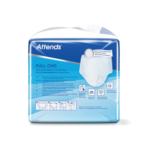 - These size XLarge Attends Pull-Ons are absorbent, disposable incontinence pants designed for heavy urinary and/or faecal incontinence. They are unisex and designed to fit like regular underwear, featuring a flexible shape and breathable material to maintain skin health. This pack contains 4 packs of 14 pants (56 pants in total).