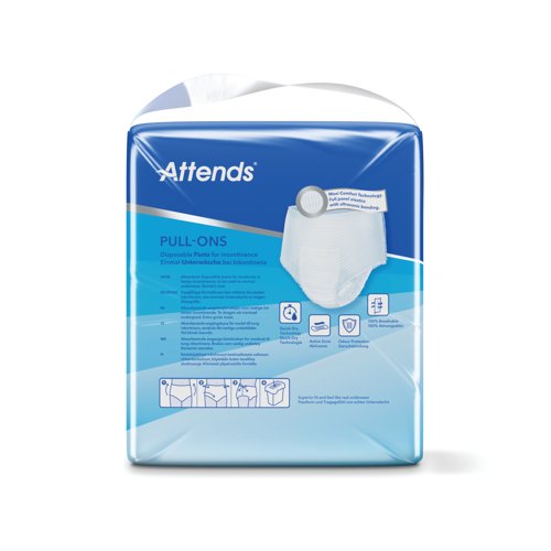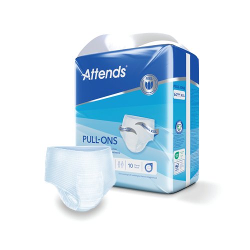 - These size XXLarge Attends Pull-Ons are absorbent, disposable incontinence pants designed for moderate to heavy urinary and/or faecal incontinence. They are unisex and designed to fit like regular underwear, featuring a flexible shape and breathable material to maintain skin health. This pack contains 4 packs of 10 pants (40 pants in total).