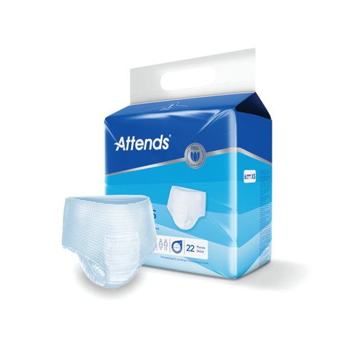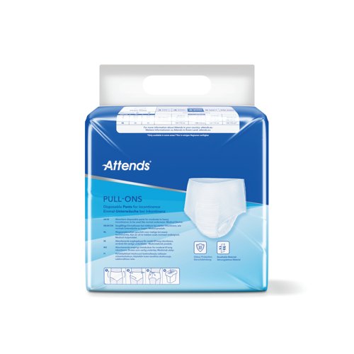 - These size XSmall Attends Pull-Ons are absorbent, disposable incontinence pants designed for moderate to heavy urinary and/or faecal incontinence. They are unisex and designed to fit like regular underwear, featuring a flexible shape and breathable material to maintain skin health. This pack contains 4 packs of 22 pants (88 pants in total).