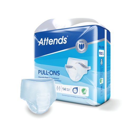 - These size Large Attends Pull-Ons are absorbent, disposable incontinence pants designed for heavy to severe urinary and/or faecal incontinence. They are unisex and designed to fit like regular underwear, featuring a flexible shape and breathable material to maintain skin health. This pack contains 4 packs of 14 pants (56 pants in total).