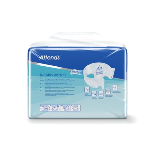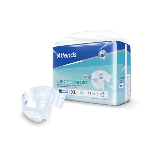 - These size XLarge Attends Slip Air Comfort nappies are designed to manage heavy urinary and/or faecal incontinence. The resealable fixation system helps to secure the product in place and reduce the risk of leakage. Designed for men and women with little to no bladder and/or bowel control. Suitable for nighttime incontinence and bedwetting; or as an alternative for children who have outgrown toddler nappies. This pack contains 4 packs of 15 nappies (60 in total).