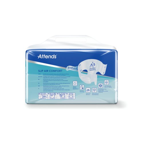 - These size Medium Attends Slip Air Comfort nappies are designed to manage heavy urinary and/or faecal incontinence. The resealable fixation system helps to secure the product in place and reduce the risk of leakage. Designed for men and women with little to no bladder and/or bowel control. Suitable for nighttime incontinence and bedwetting; or as an alternative for children who have outgrown toddler nappies. This pack contains 4 packs of 30 nappies (120 in total).