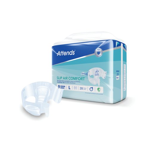 - These size Large Attends Slip Air Comfort nappies are designed to manage heavy urinary and/or faecal incontinence. The resealable fixation system helps to secure the product in place and reduce the risk of leakage. Designed for men and women with little to no bladder and/or bowel control. Suitable for nighttime incontinence and bedwetting; or as an alternative for children who have outgrown toddler nappies. This pack contains 4 packs of 28 nappies (112 in total).