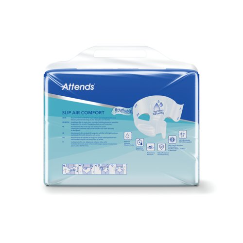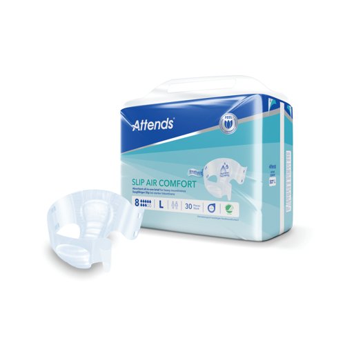 - These size Large Attends Slip Air Comfort nappies are designed to manage heavy urinary and/or faecal incontinence. The resealable fixation system helps to secure the product in place and reduce the risk of leakage. Designed for men and women with little to no bladder and/or bowel control. Suitable for nighttime incontinence and bedwetting; or as an alternative for children who have outgrown toddler nappies. This pack contains 4 packs of 30 nappies (120 in total).