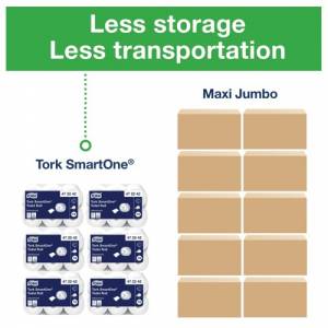 - Reduce washroom paper consumption with our Tork SmartOne Toilet Roll. It provides one sheet at a time for hygienic use. This high-capacity roll fits in a range of SmartOne dispensers for demanding washrooms with high traffic. Its dispensing method cuts consumption by up to 40% compared to jumbo toilet roll dispensers, meaning more visits per roll and less maintenance. Blocked pipes are minimised due to the paper's quick disintegration and packaging is hassle-free with the Tork Easy Handling Bag.