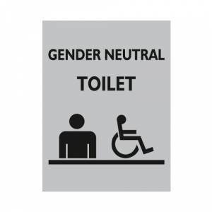 - This Gender Neutral toilet sign features a black pictogram on a silver coloured background, designed for use on unisex toilet doors. Making a stylish addition, the sign can be fixed to a toilet door without the use of a drill, by simply sticking it on a clean, flat surface. Suitable for walls and doors, the adhesive backed sign is made from acrylic and measures 150mm x 200mm.