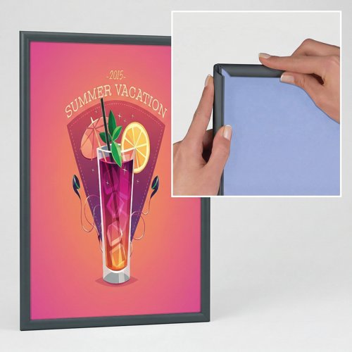 - A very neat narrow 15mm profile snap frame for smaller sizes. It is so easy to clip open the aluminium frame to access your poster or graphic image which is protected by an anti-glare plastic cover sheet. Available in grey powdercoat finish.