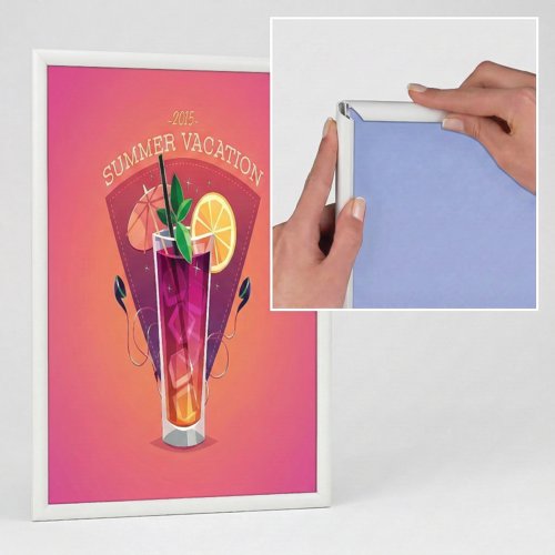 - A very neat narrow 15mm profile snap frame for smaller sizes. It is so easy to clip open the aluminium frame to access your poster or graphic image which is protected by an anti-glare plastic cover sheet. Available in white powdercoat finish.