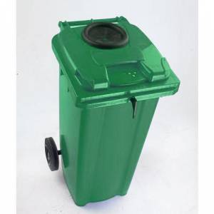 Capacity L: 140. Colour: Green. Depth mm: 555. Height mm: 1070. Material: UV stabilised polyethylene. Product Type: Two wheel bins. Type: 2 wheeled bins with bottle bank aperture and lid lock. Width mm: 480.