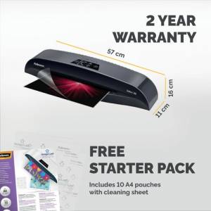 This professional Fellowes Calibre laminator features Instaheat technology for an ultra fast 1 minute warm up time. The laminator also features a laminating speed of 50cm per minute, jam sensor and reverse button for fast and efficient laminating. Ideal for busy offices, the Hot Swap technology switches instantly between pouch thicknesses for simple use. Suitable for laminating documents up to A3 in size, this pack contains 1 black laminator.