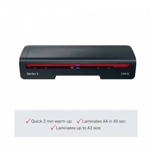 - The GBC 240HS is a sleek and efficient solution for everyday laminating needs. Designed with both style and performance in mind, this high-speed A3 laminator is ideal for home or home office use. Boost productivity and reduce lamination time by 30% using GBC high-speed pouches. With a fast 2-minute warm-up time, it laminates a 75-micron A4 sheet in just 45 seconds, making it perfect for efficiently handling your home projects. The easy-to-use control switch offers three pouch thickness settings from 75-125 microns, providing flexibility for various document types. An anti-jam release lever ensures smooth operation by effortlessly resolving any misfed pouches. Additionally, the smart status LED system simplifies operation with clear visual and audible cues: red during warm-up, blue with a sound when ready, and an automatic shut-off after 15 minutes of inactivity to conserve energy.