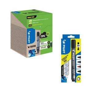 - Pilot's V-Board Marker Pens are high quality bullet tip markers that do not compromise on quality. Containing no xylene or similar solvents, these low odour drywipe marker pens are perfect for the classroom and meeting rooms alike. The drywipe ink can be easily erased from all types of whiteboard surfaces using a cloth. To help you do your bit for the planet, these marker pens are refillable and made with 91% recycled material. This promotional pack contains 10 black drywipe markers plus a FREE pack of 4 Pilot 100 assorted permanent markers.