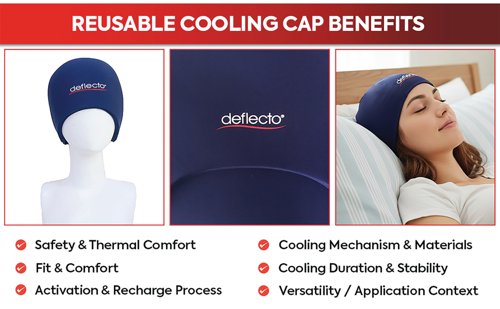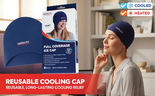 - Deflecto Reusable Cool and Heat Cap provides targeted pain relief for headaches and migraines while helping to reduce temperature. The cap gives immediate comfort from heat, tension or fatigue whilst its dual comfort technology gives you the option of transitioning between hot and cold cycles. To use, let the pad cool completely after heating. Placing a hot pad directly into the freezer can damage the material and reduce product life. To prevent moisture buildup or freezer burn, place in a ziplock or freezer-safe bag. Freeze or refrigerate for at least two hours, or overnight for best results.