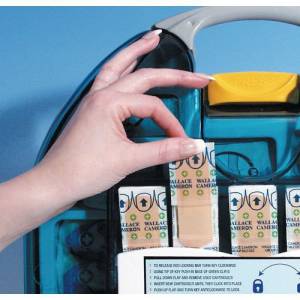 - Suitable for up to ten people, the Wallace Cameron Adulto Premier First Aid Dispenser offers everything you need to provide quick and effective first aid. With features that exceed HSE recommendations, it includes a handy accident book and pen as well as pilfer proof plasters dispensed from the door. The unit has an integral wall mounting bracket to allow easy access as well as a plastic carry handle to provide great portability.