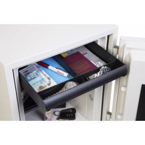 This Phoenix Titan 36 litre safe provides 60 minutes fire protection for paper and digital media. Fitted with a pull-out drawer, height adjustable shelf and 4 key hooks. Fitted with a high security electronic lock with convenient LED display, the safe also features dual control, hidden code and scrambled code as standard. Recommended for overnight cover of up to 2,000 GBP cash or 20,000 GBP valuables, the safe is ready prepared for floor fixing, with 2 fixing bolts for concrete floors supplied. The safe is drop tested to 9.1 metres for resistance to the impact of falling through the burning floors of a building. This white 36 litre safe measures W300 x D300 x H410mm (internal). Installation is available, price on application.
