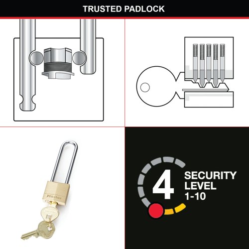 - Made with a solid brass body and hardened steel shackle this Master Lock padlock is reassuringly cut-resistant to help you keep your possessions safe and sound. This padlock has been designed with dual locking levers and a 4-pin cylinder for added protection against theft. Recommended for general indoor use, this padlock is perfect for locking cabinets, trunk boxes and lockers. It has a Limited Lifetime Warranty to give you extra peace of mind.