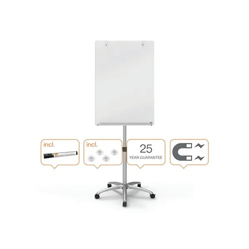 | Features lockable castors for easy manoeuvrability between rooms and comes complete with a Nobo dry wipe marker and 2 extra strong magnets, plus a spacious pen tray sits below the board to hold dry wipe markers, erasers and other accessories |